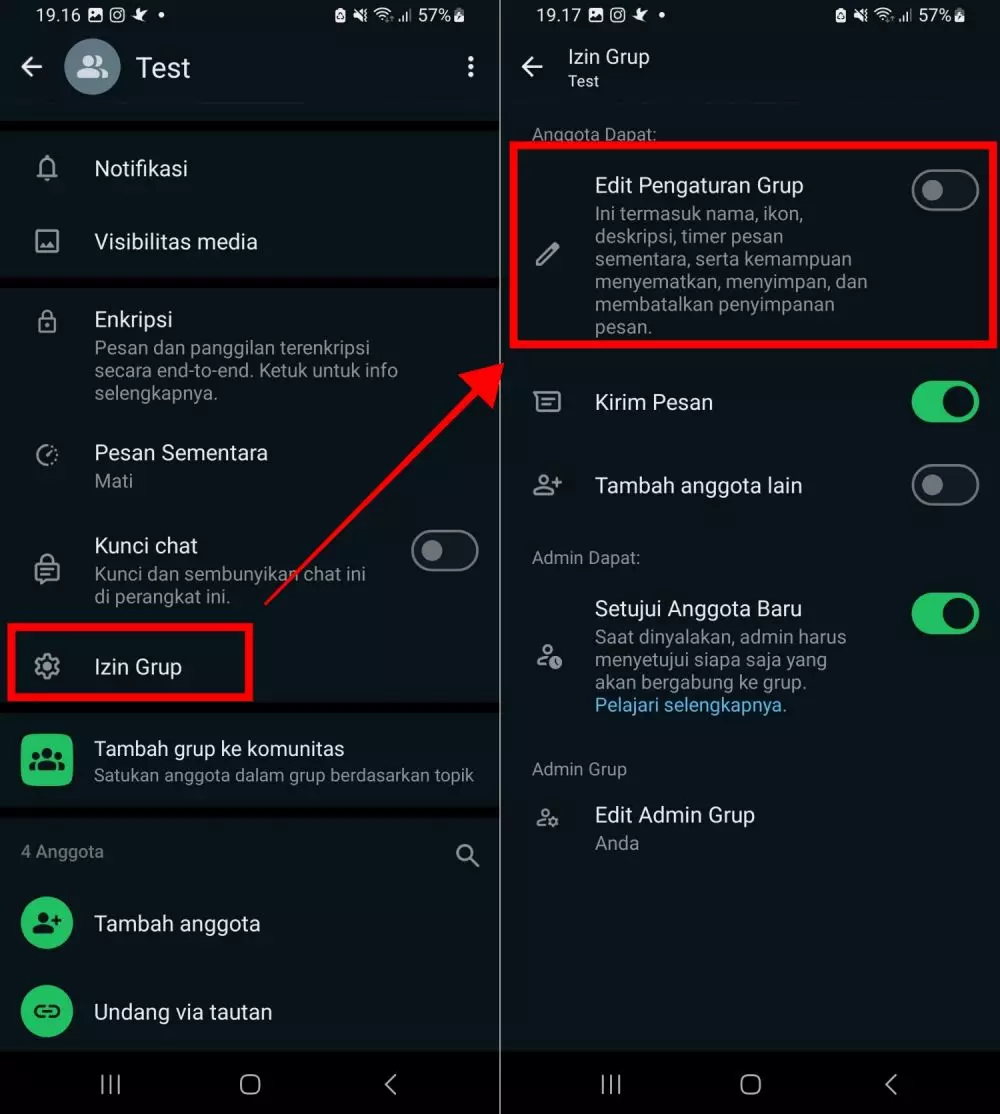 Untuk melakukan ini, admin dapat mengakses halaman detail grup, ketuk Izin Grup, dan menonaktifkan sakelar untuk Edit Pengaturan Grup dan Tambahkan Anggota Lain. Perubahan sederhana ini sangat membantu dalam mempertahankan kendali dan menghindari konflik atau kesalahpahaman yang tidak perlu.