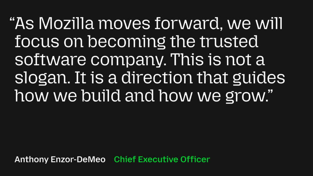 Firefox will grow from a browser into a broader ecosystem of trusted software. Firefox will remain our anchor. It will evolve into a modern AI browser and support a portfolio of new and trusted software additions.